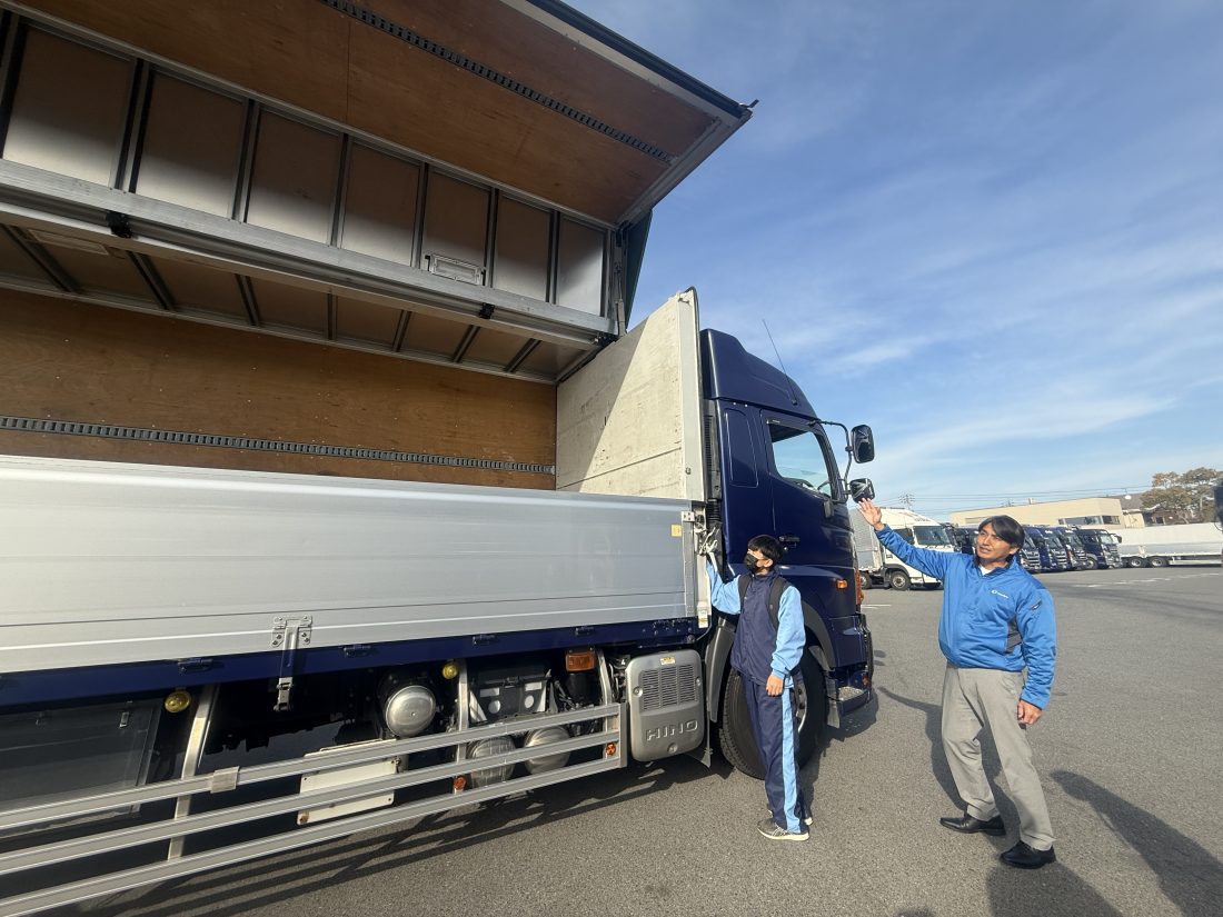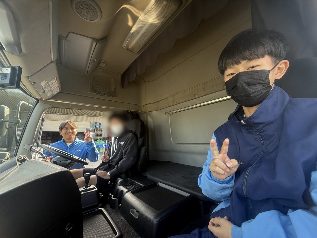大型トラックへの乗車体験、ウイングの開閉見学などを行いました。